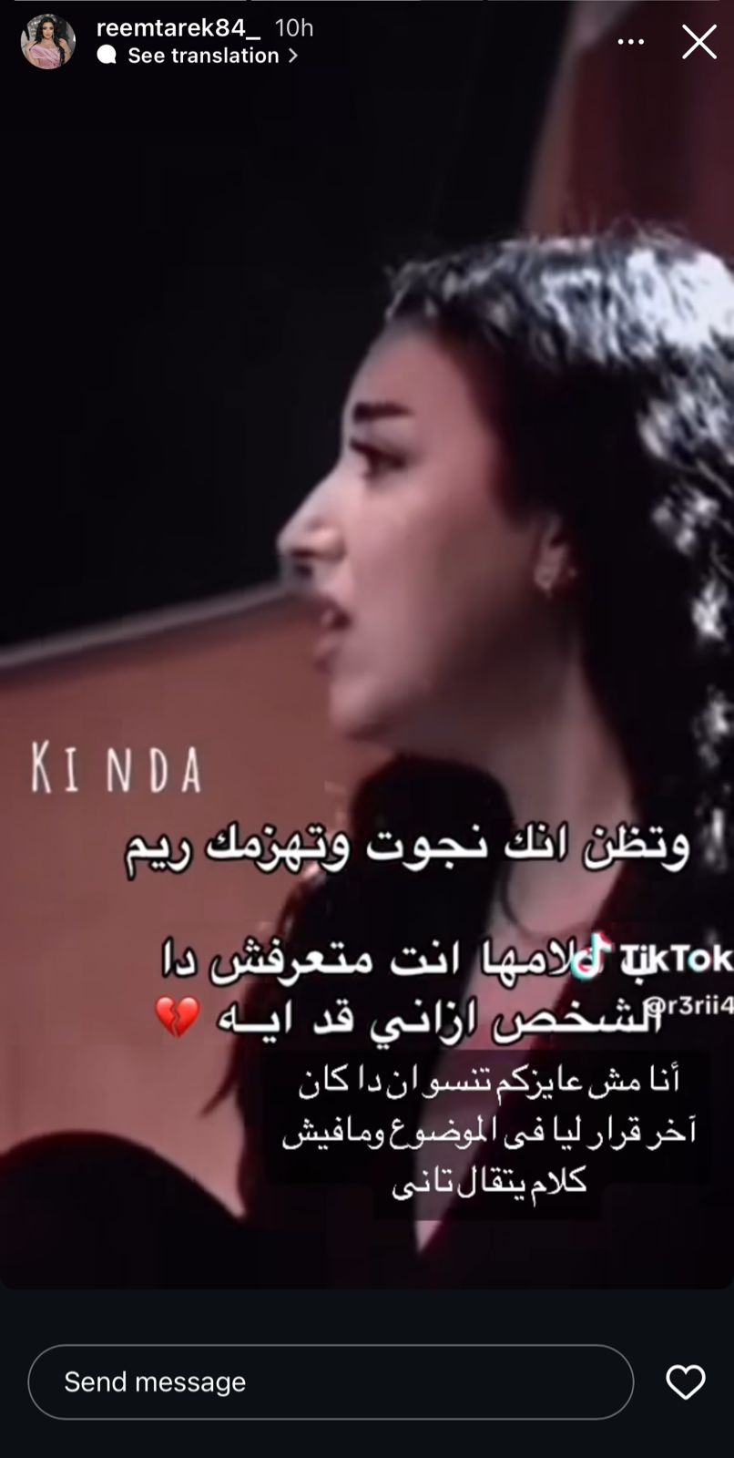 كتبت ريم طارق منشورًا عبر خاصية استوري عبر حسابها الشخصي بموقع إنستجرام قائلة: أنا مش عايزاكم تنسوا إن الطلاق كان آخر قرار ليّا في الموضوع ومفيش كلام يتقال تاني.