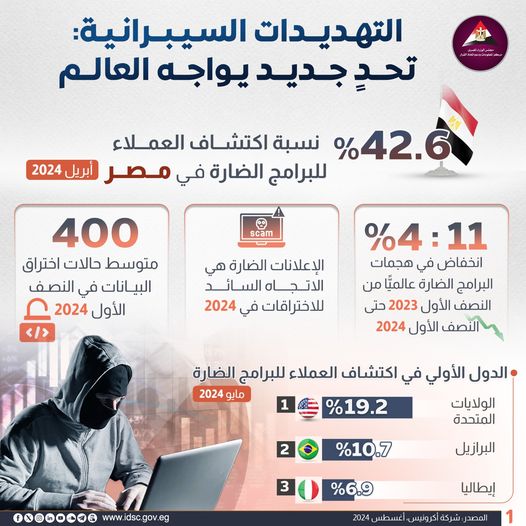 كشف مركز المعلومات ودعم اتخاذ القرار بمجلس الوزراء، أنه رغم الانخفاض العالمي في هجمات البرامج الضارة، إلا أن التهديدات السيبرانية لا تزال تشكل تحديًا كبيرًا.