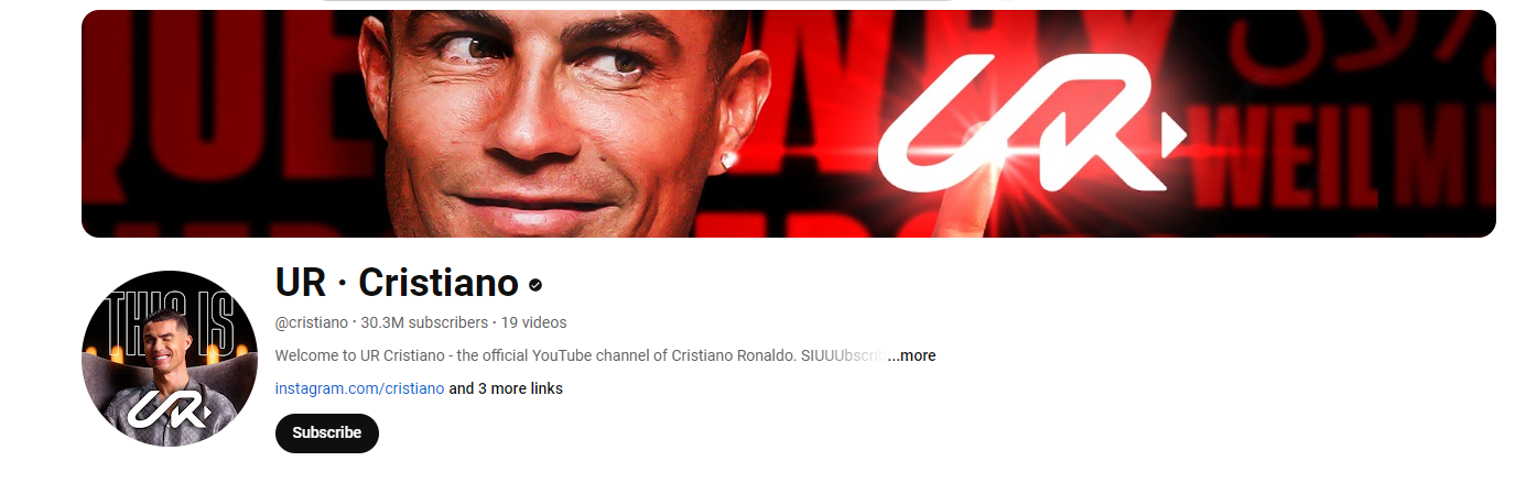 وأطلق رونالدو قناة على يوتيوب تحمل عنوان UR، حيث تضم حوالي11 مقطع فيديو قصيرًا لنجم كرة القدم، وهو يستمتع مع زوجته وأطفاله بالإضافة إلى مقاطع فيديو تحفيزية تستند إلى تجاربه.