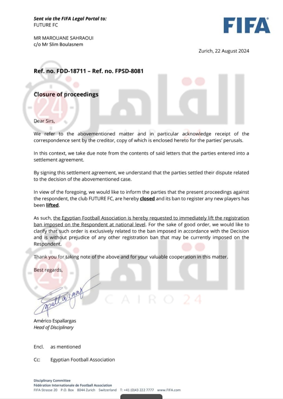 وكان القاهرة 24 نشر أمس خطاب فيفا لحل أزمة إيقاف القيد.