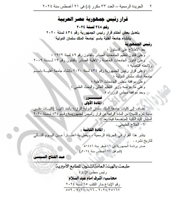 وقالت الجريدة الرسمية، إنه بعد الاطلاع على الدستور، وعلى قانون تنظيم الجامعات الصادر بالقانون رقم 49 لسنة 1972، وعلى قانون الجامعات الخاصة والأهلية الصادر بالقانون رقم 12 لسنة 2009 ولائحته التنفيذية، وعلى قرار رئيس الجمهورية بإنشاء جامعة أهلية باسم جامعة الملك سلمان الدولية، وعلى موافقة مجلس الجامعات الأهلية، وعلى ما عرضه وزير التعليم العالي والبحث العلمي، وبعد موافقة مجلس الوزراء، قرر:
