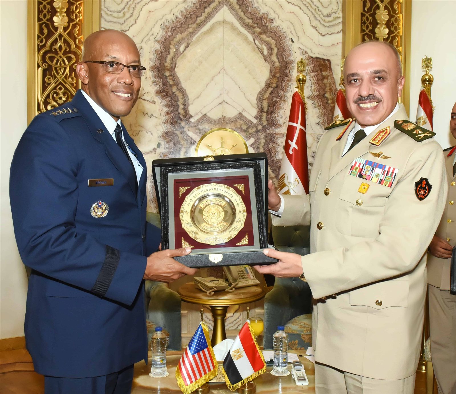 التقى الفريق أحمد خليفة رئيس أركان حرب القوات المسلحة، الفريق أول تشارلز براون رئيس هيئة الأركان المشتركة الأمريكية والوفد المرافق له الذى يزور مصر حاليًا، حيث أجريت له مراسم استقبال رسمية بمقر الأمانة العامة لوزارة الدفاع وعزفت الموسيقات العسكرية السلام الوطني لكلا البلدين.