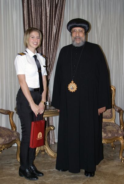 الأنبا إرميا رئيس المركز الثقافي القبطي الأرثوذكسي يستقبل ميرولا ماجد أصغر كابتن طيار في مصر