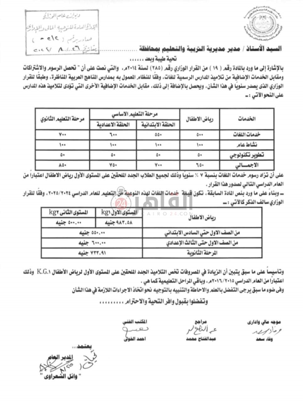 وقالت الوزارة، في خطاب لها، إنه بالإشارة إلى ما ورد بالمادة رقم 19 من القرار الوزاري رقم 285 لسنة 2014، والتي نصت على أن تحصل الرسوم والاشتراكات، ومقابل الخدمات الإضافية من تلاميذ المدارس الرسمية للغات، وفقا للنظام المعمول به بمدارس المناهج العربية المناظرة، وطبقا للقرار الوزاري الذي يصدر سنويا في هذا الشأن، ويحصل بالإضافة إلى ذلك، مقابل الخدمات الإضافية الأخرى التي تؤدي لتلاميذ هذه المدارس على النحو الآتي:-