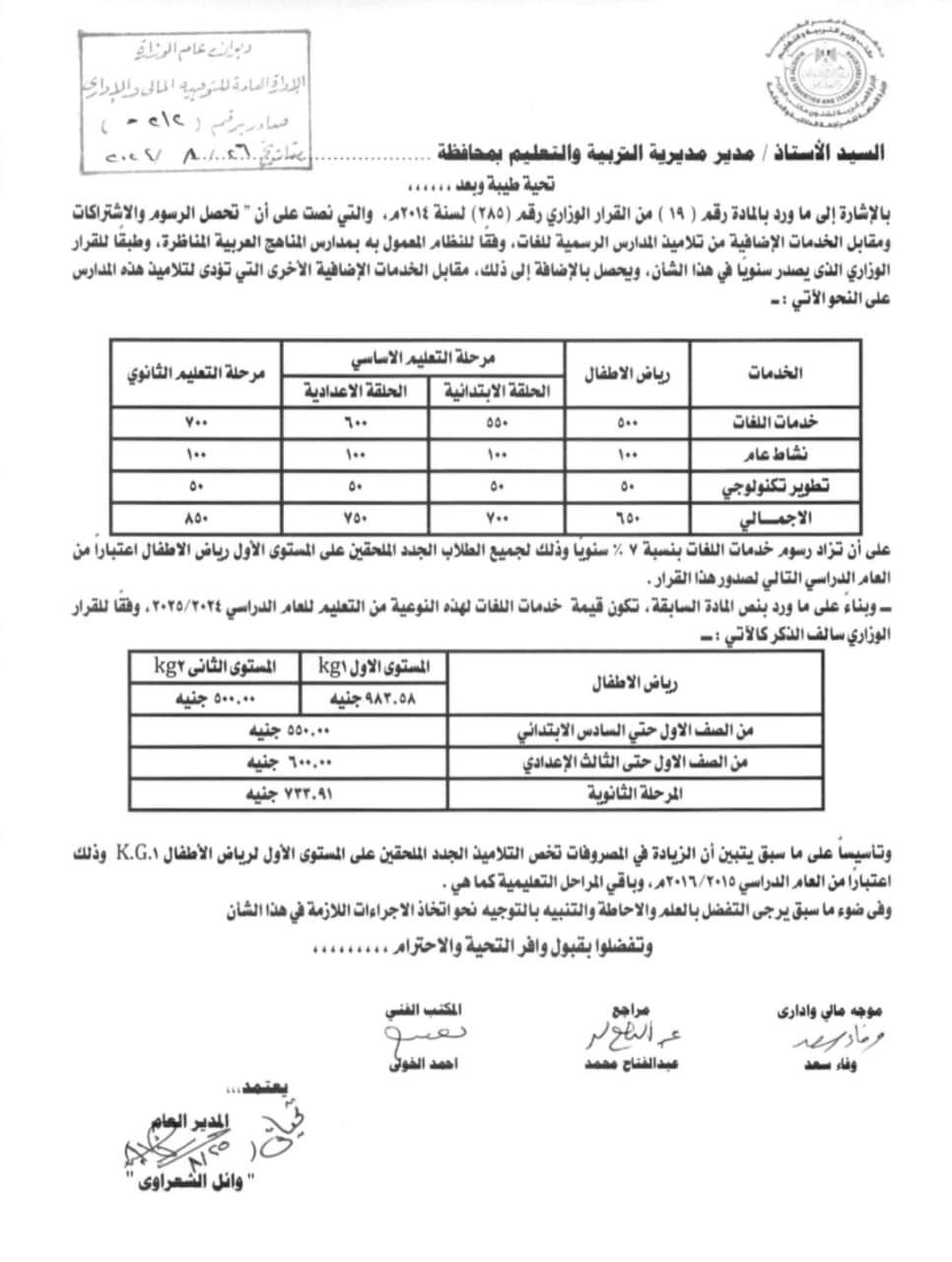 وقالت الوزارة، في خطاب لها، إنه بالإشارة إلى ما ورد بالمادة رقم ( 19 ) من القرار الوزاري رقم 285 لسنة 2014م، والتي نصت على أن تحصل الرسوم والاشتراكات، ومقابل الخدمات الإضافية من تلاميذ المدارس الرسمية للغات، وفقا للنظام المعمول به بمدارس المناهج العربية المناظرة، وطبقا للقرار