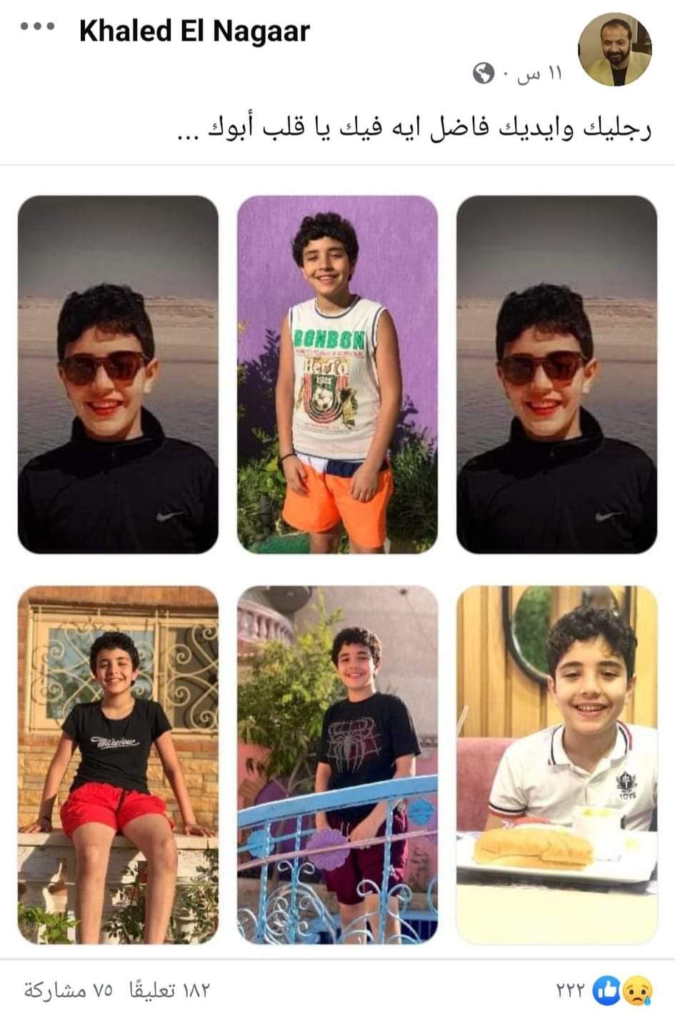 وكتب والده خالد النجار، عبر حسابه على موقع التواصل الاجتماعي فيس بوك: رجلك وإيديك فاضل إيه فيك يا قلب أبوك، ونعاه بكلمات برسالة مؤثرة قائلا: معقولة جنازتك يا عدعود، تكون من غير ما أكون موجود، مات الحلم ومش حيعود، يا أغلى ابن فى أغبى وجود.