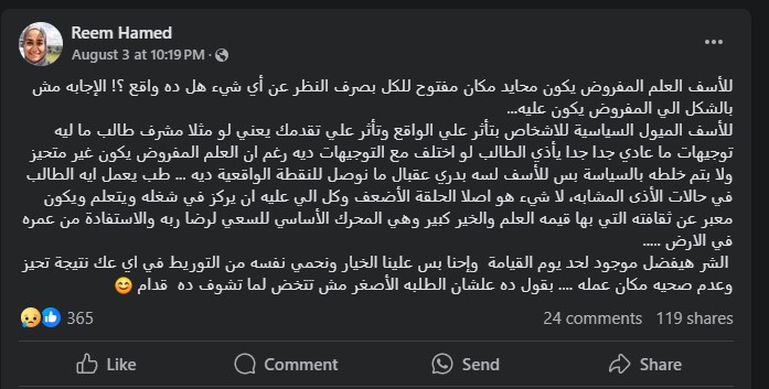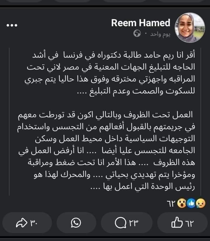 لكن اللافت في منشورات ريم حامد على موقع التواصل الاجتماعي فيس بوك، هو اعترافها بأنها شاركت من وجهت إليهم الاتهامات في جرائمهم التي قالت إنها جرائم تجسس واستخدام التوجيهات السياسية داخل محيط العمل وسكن الجامعة للتجسس قائلة: أنا أرفض العمل في هذه الظروف، أنا تحت ضغط ومراقبة ومؤخرا يتم تهديدي بحياتي، والمحرك لهذا هو رئيس الوحدة التي أعمل بها، لتوجه بذلك اتهاما مباشرًا بتعرضها للمراقبة والمضايقات من قِبل رئيس الوحدة التي تعمل بها.
