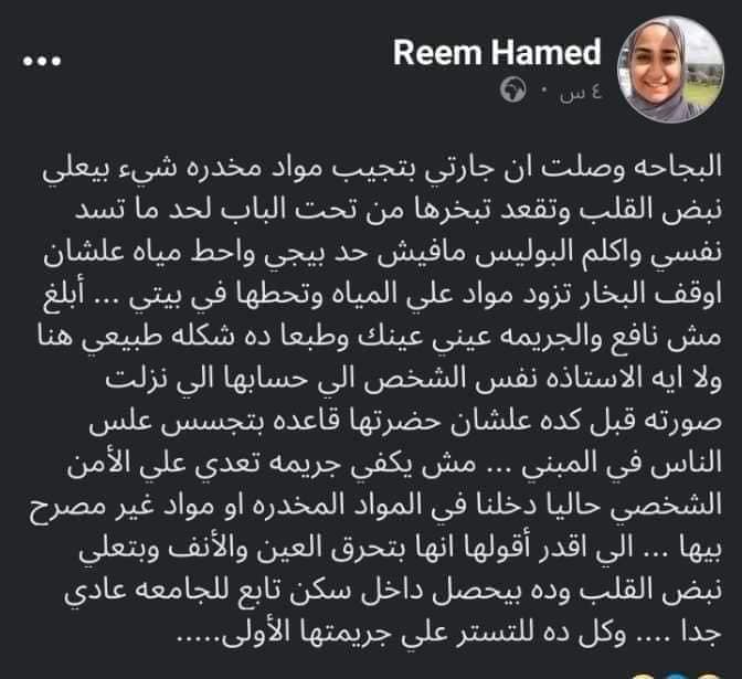 وكشفت ريم في أحد منشوراتها على موقع التواصل الاجتماعي فيس بوك، أن جارتها تلاحقها بمواد مخدرة تعمل على زيادة نبضات القلب وتمررها إليها عبر التدخين من أسفل باب غرفتها للتأثير عليها بهواء ملوث بالمواد المخدرة المشار إليها، وأنها سعت لإبلاغ الشرطة الفرنسية لكن دون جدوى، إلى جانب قولها بأن جارتها ذاتها تتجسس عليها وعلى آخرين بمحل سكنها.