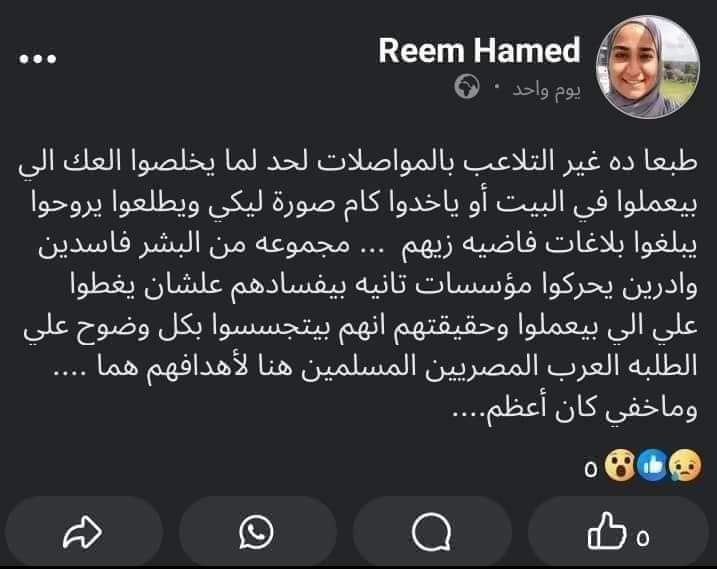 واستكملت صديقة الباحثة المتوفاة لـ القاهرة 24: كنت عارفة من كلامها بشكل عام أن فيه ناس كتير هناك بيعملوها بعنف واضطهاد، وافتكر أن من الحاجات اللي كانت بتثير غضب ريم أوي أن نظام الجامعة كان بيجبرها تقلع الحجاب خلال تصوير صورة بطاقة الهوية الجامعية.