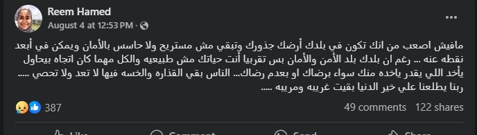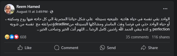 وهو ما آثار تساؤلا بشأن ما شعرت به ريم حامد وحالتها النفسية قبل وفاتها، أجابت عليه منشورات ريم نفسها قبيل الوفاة بأيام وأسابيع قليلة، إذ رصدنا مطالبتها بالتواصل مع مدربة لايف كوتش، وحديثها في العديد من المنشورات بأنها تتعرض لضغوط حياتية ونفسية كبيرة، واصفة حياتها بأنها غير طبيعية، داعية في أحدها بالانتقام ممن يسئ إليها، قائلة في أخرى: ربنا يطلعنا على خير الدنيا بقيت غريبة ومريبة.
