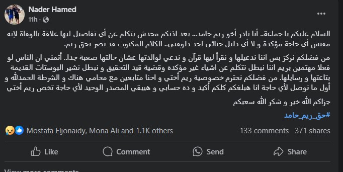 وفي منشور سابق له أضاف نادر أيضًا، أنه لا يوجد أي دليل جنائي بشأن وفاة ريم حامد، الباحثة المصرية في معهد بيولوجيا الخلية التكاملية بـ جامعة باريس.