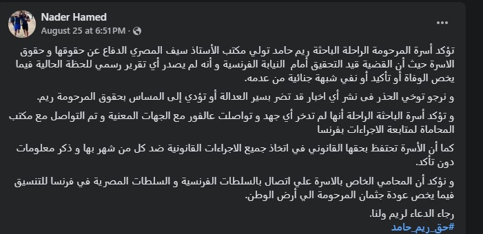 كما علم القاهرة 24، أن سيف المصري، محامي ريم حامد، ينتظر إتمام بعض الإجراءات الأولية، والانتهاء من التقارير الفرنسية بشأن الجثمان والوفاة لتشييع الجثمان، والبدء في التحقيقات اللازمة مستخدمًا دفوعه القانونية لكشف أسباب وفاة الباحثة المصرية، والتعرف على الجاني حال وجود شبهة جنائية لوفاتها.