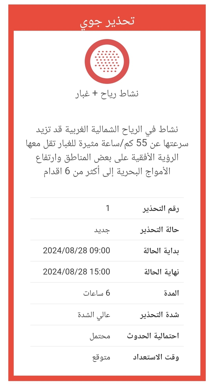 وحذرت إدارة الأرصاد الجوية من نشاط للرياح خلال طقس الكويت اليوم، حيث يكون هناك نشاط في الرياح الشمالية الغربية قد تزيد سرعتها عن 55 كم/ساعة مثيرة للغبار تقل معها الرؤية الأفقية على بعض المناطق وارتفاع الأمواج البحرية إلى أكثر من 6 أقدام.