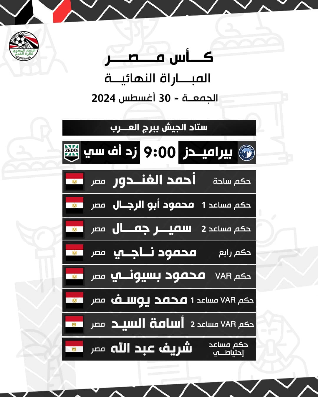 ومن المقرر أن تقام، المباراة النهائية لـ كأس مصر بين بيراميدز وزد إف سي يوم الجمعة المقبل 30 أغسطس، على ستاد الجيش في برج العرب.