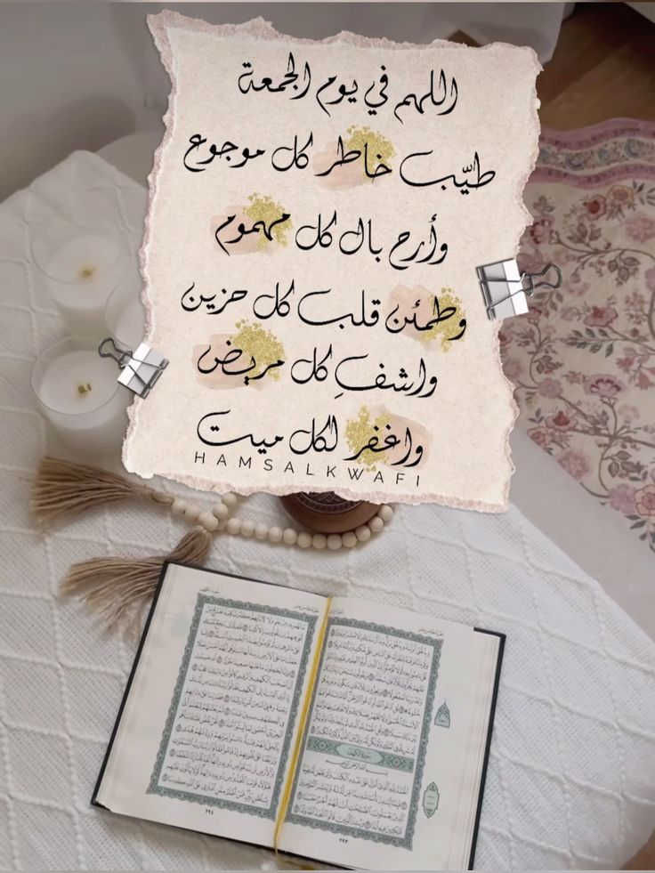- اللهُم في يوم الجمعة المباركة ألف بين قلوبِنا، وأصلِح ذاتَ بيننا، واهدِنا سُبل السلام، ونجِّنا من الظلماتِ إلى النور، وجنّبنا الفواحِش، وبارِك لنا في أسماعنا، وأبصارنا، وقلوبنا، وأزواجنا، وذرياتنا، وتُب علينا إنك أنتَ التواب الرحيم.