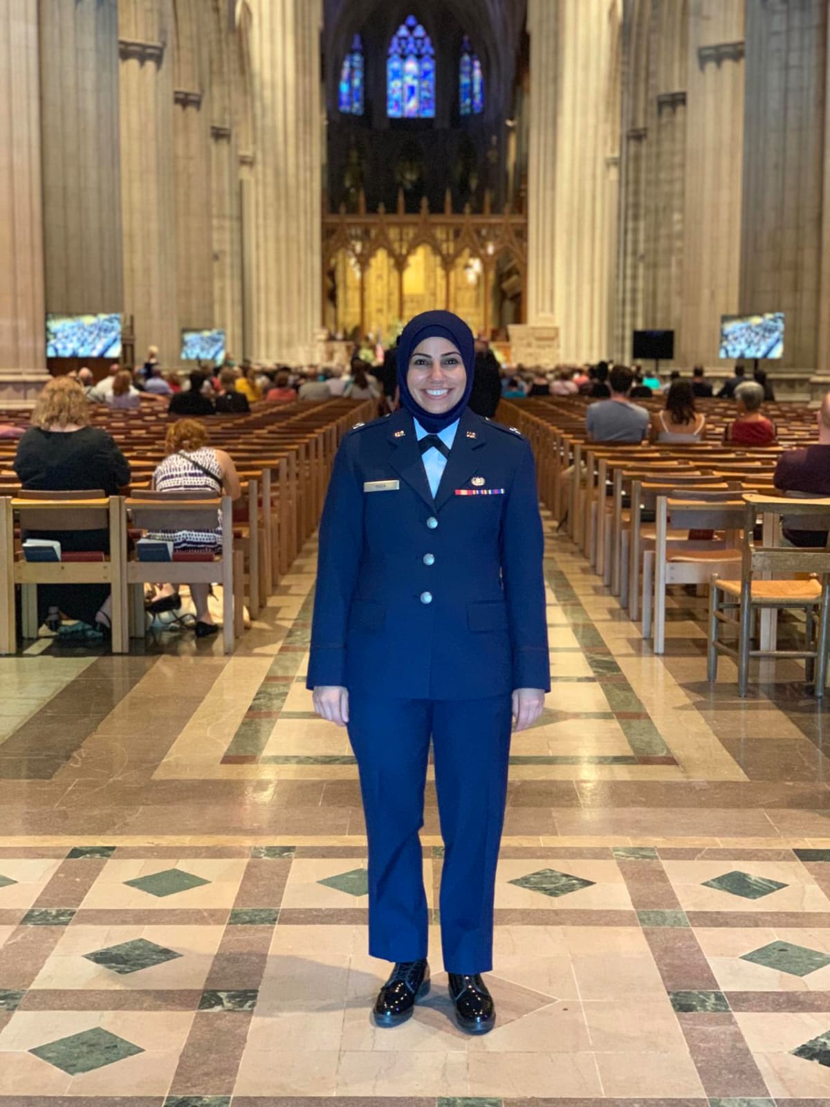 وأوضحت أنها ترتدي الحجاب بكل فخر، مشيرة إلى أنها لم تر أي مسلمة أخرى ترتدي الحجاب بالزي الرسمي عندما انضمت لأول مرة لسلاح الجو.