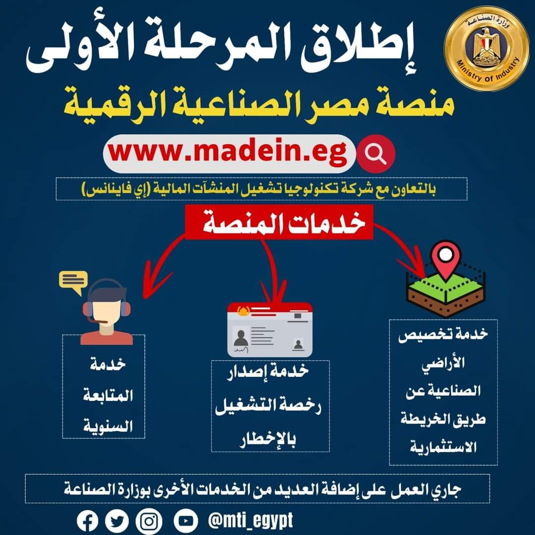 أعلنت وزارة الصناعة إطلاق المرحلة الأولى من منصة مصر الصناعية، بالتعاون مع شركة تكنولوجيا تشغيل المنشآت المالية “آي فاينانس”، ومن أبرز خدمات منصة مصر الصناعية التي تعد بمثابة القناة الرئيسية بين المستثمرين الصناعيين وكافة الجهات، وفقا لما أعلنته الهيئة العامة للتنمية الصناعية عبر صفحتها الرسمية بموقع فيس بوك ما يلي: