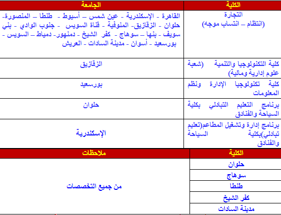 يتوفر لطلاب الدبلومات الفنية نظام 3 سنوات، كليات التجارة بنظام الانتظام والانتساب في عدد كبير من الجامعات الحكومية، وكلية التكنولوجيا والتنمية، وكلية تكنولوجيا الإدارة ونظم المعلومات، كلية السياحة والفنادق جامعة حلوان وجامعة الإسكندرية، وعدد كبير من المعاهد الفنية الصحية سواء التابعة لوزارة الصحة، أو التابعة للجامعات.