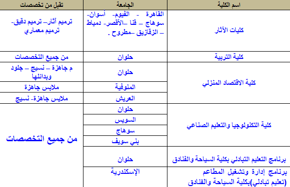 وأما كليات ومعاهد الدبلومات الفنية الصناعية نظام 3 سنوات، تتوفر في كليات الآثار بعدد من الجامعات الحكومية، وكلية التربية جامعة حلوان، وكليات الاقتصاد المنزلي، وكليات التكنولوجيا والتعليم الصناعي، وكلية سياحة وفنادق جامعتي حلوان والإسكندرية، فضلا عن المعاهد الفنية الصحية، والمعاهد الفنية الصناعية، والجامعات التكنولوجية.