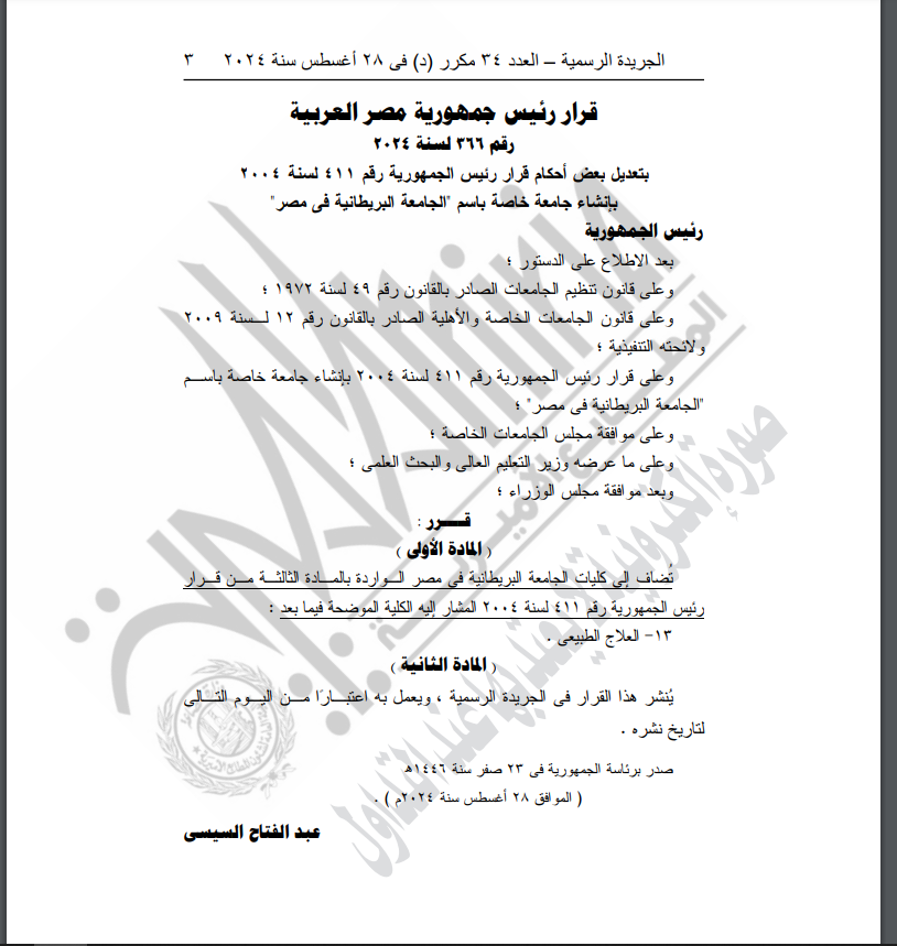 وأكدت الجريدة الرسمية في منشورها، بعد الاطلاع على الدستور، وعلى قانون تنظيم الجامعات الصادر بالقانون رقم 49 لسنة 1972، وعلى قانون الجامعات الخاصة والأهلية الصادر بالقانون رقم 12 لسنة 2009 ولائحته التنفيذية، وعلى قرار رئيس الجمهورية رقم 411 لسنة 2004 بإنشاء جامعة خاصة باسم الجامعة البريطانية في مصر، وعلى موافقة مجلس الجامعات الخاصة، وعلى ما عرضه وزير التعليم العالي والبحث العلمي، وبعد موافقة مجلس الوزراء؛ تقرر إضافة كلية العلاج الطبيعي إلى كليات الجامعة البريطانية.