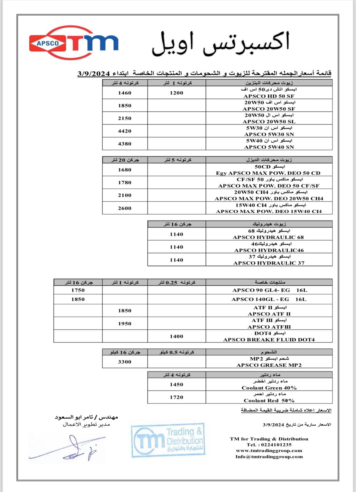 يُشار إلى أن شركتا التعاون للبترول ومصر للبترول، رفع أسعار الزيوت والشحومات والمنتجات الخاصة اعتبارًا من اليوم 28 أغسطس 2024، حيث أخطرتا الموزعين على مستوى محافظات مصر بهذا القرار.
