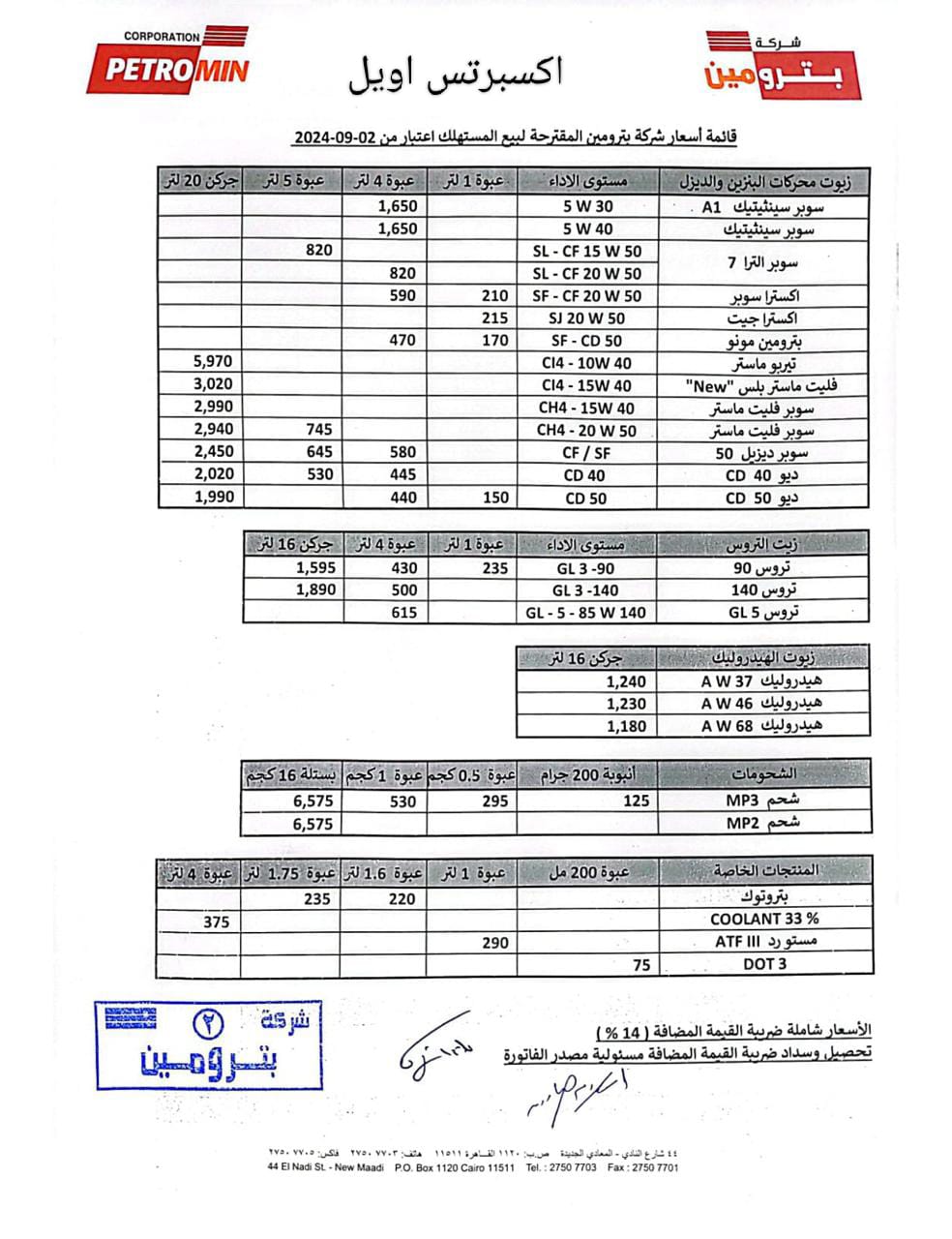 أعلنت شركتا بترومين مصر وإبسكو قوائم الأسعار الجديدة لمنتجات زيوت محركات البنزين والديزل، وزيوت التروس والهيدروليك والشحومات والمنتجات الخاصة، والتي اشتملت على زيادة أسعار بعض المنتجات مقارنة بالقوائم السابقة، وفق تجار لـ القاهرة 24.