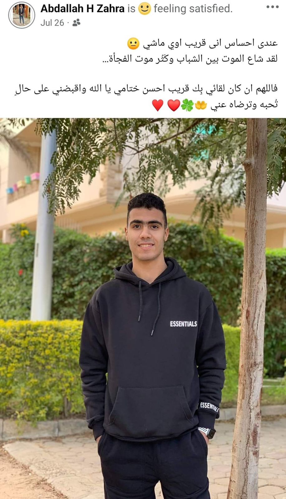 وتداول أصدقاء الشاب الذي يدعى عبد الله زهرة منشورا له كتبه في شهر يونيو، حيث تنبأ بوفاته في بوست قال فيه: عندي إحساس إني قريب أوي ماشي.. لقد شاع الموت بين الشباب وكثر موت الفجأة.