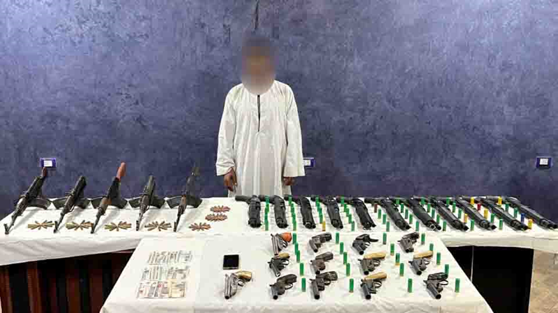 عقب تقنين الإجراءات تم ضبطه، وبحوزته 5 بنادق آلية و11 بندقية خرطوش و13 فرد محلي وعدد من الطلقات مختلفة الأعيرة ومبلغ مالي من متحصلات نشاطه، بمواجهته أقر بنشاطه الإجرامي على النحو المشار إليه، وتم اتخاذ الإجراءات القانونية.