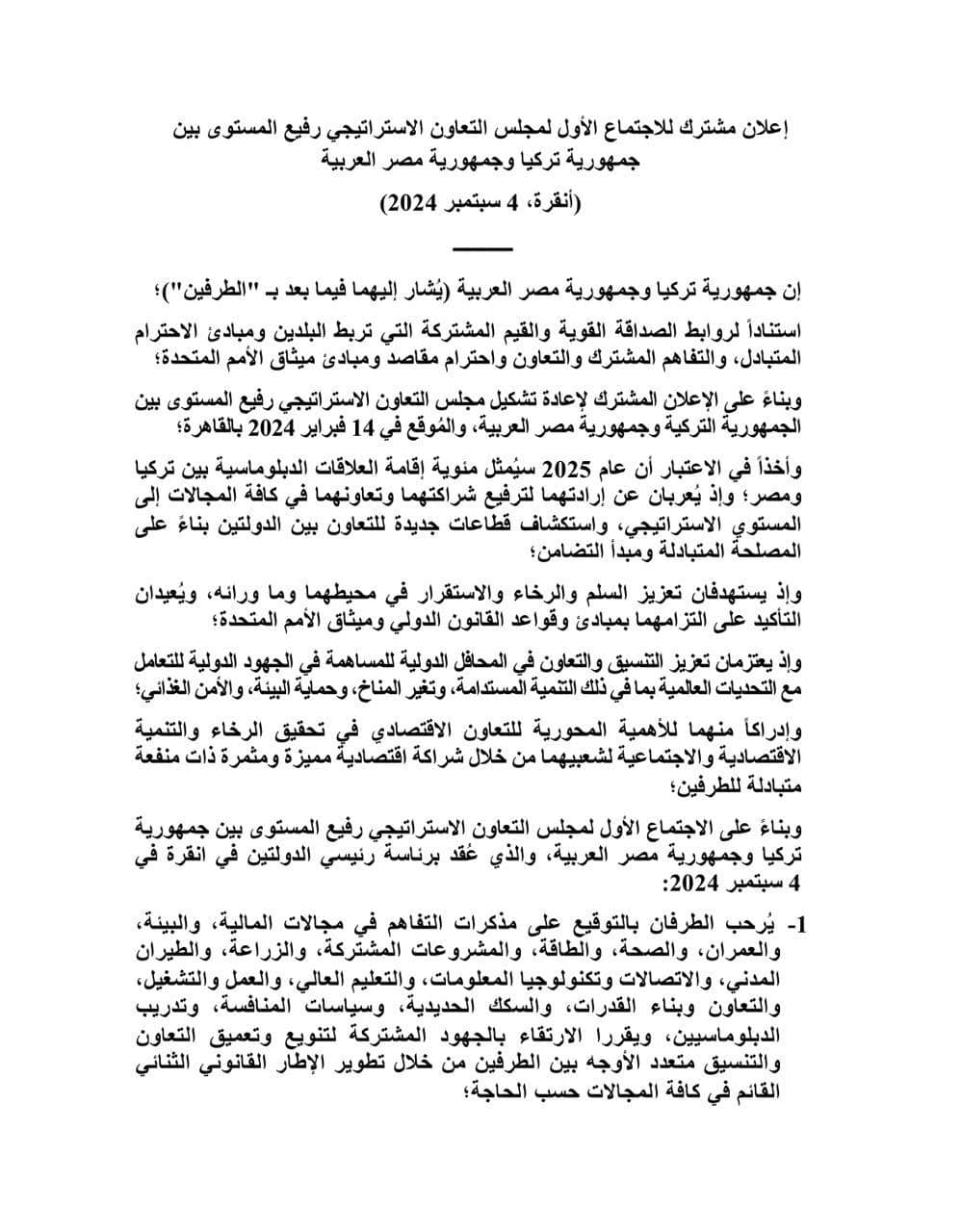 الإعلان المشترك للاجتماع الأول لمجلس التعاون الاستراتيجي رفيع المستوى بين مصر وتركيا