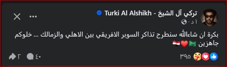 ونشر تركي آل الشيخ عبر حسابه الرسمي على موقع التواصل الاجتماعي فيسبوك: بكرة إن شاء الله سنطرح تذاكر السوبر الإفريقي بين الأهلي والزمالك.. خلوكم جاهزين.