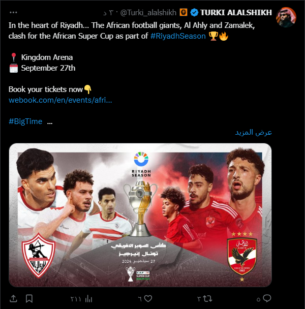 ونشر تركي آل الشيخ عبر حساباته الرسمية على مواقع التواصل الاجتماعي منشورًا به رابط، إذ أعلن من خلاله طرح تذاكر مباراة الأهلي والزمالك في نهائي السوبر الإفريقي.
