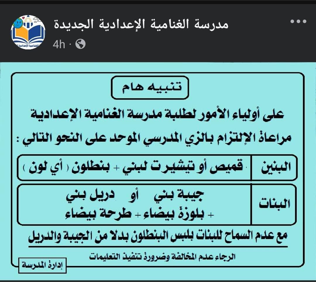 وأشارت المدرسة عبر صفحتها الرسمية على موقع التواصل الاجتماعي فيسبوك، إلى عدم السماح للبنات بلبس البنطلون بدلًا من الجيبة والدريل، مؤكدة عدم المخالفة وتنفيذ التعليمات.