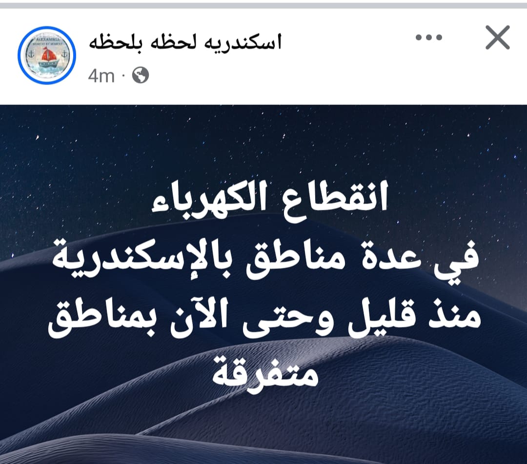 وانتشرت عبر صفحات مواقع التواصل الاجتماعي، منشورات من عدد من سكان الإسكندرية تفيد بانقطاع الكهرباء في مناطق مختلفة منها المندرة وسيدي بشر ومحرم بك والحضرة وسموحة والعجمي والورديان وبحري، متسائلين عن سبب الانقطاع المفاجئ في وقت واحد رغم استقرار حالة الكهرباء.