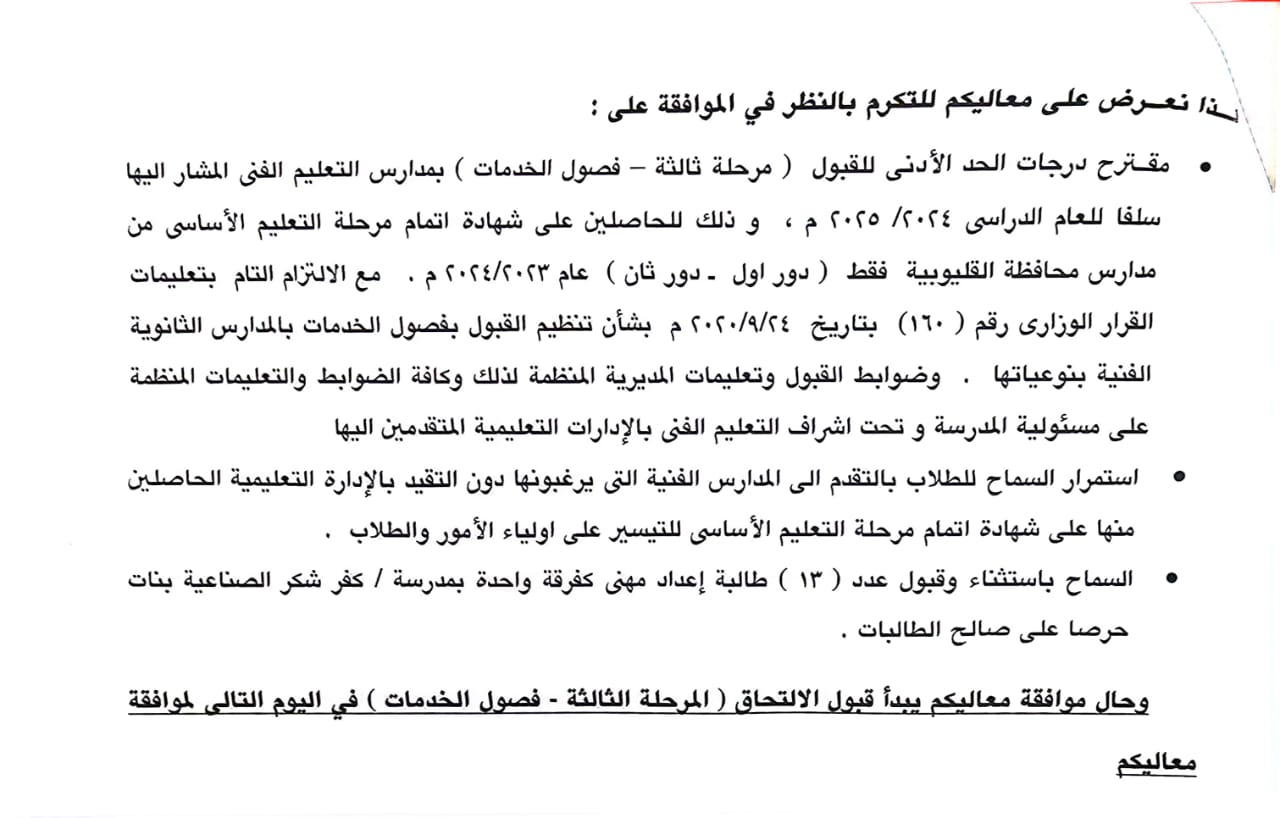 وافق المهندس أيمن عطية، محافظ القليوبية، على ما تم عرضه من سماح إبراهيم وكيل وزارة التربية والتعليم بالقليوبية بشأن النزول بدرجات القبول بفصول الخدمات ببعض المدارس الفنية بنوعياتها (صناعي- تجاري وفندقي- مزدوج) بالمحافظة للطلاب الحاصلين على شهادة إتمام الدراسة بمرحلة التعليم الأساسي للعام الدراسي عام 2023/2024.