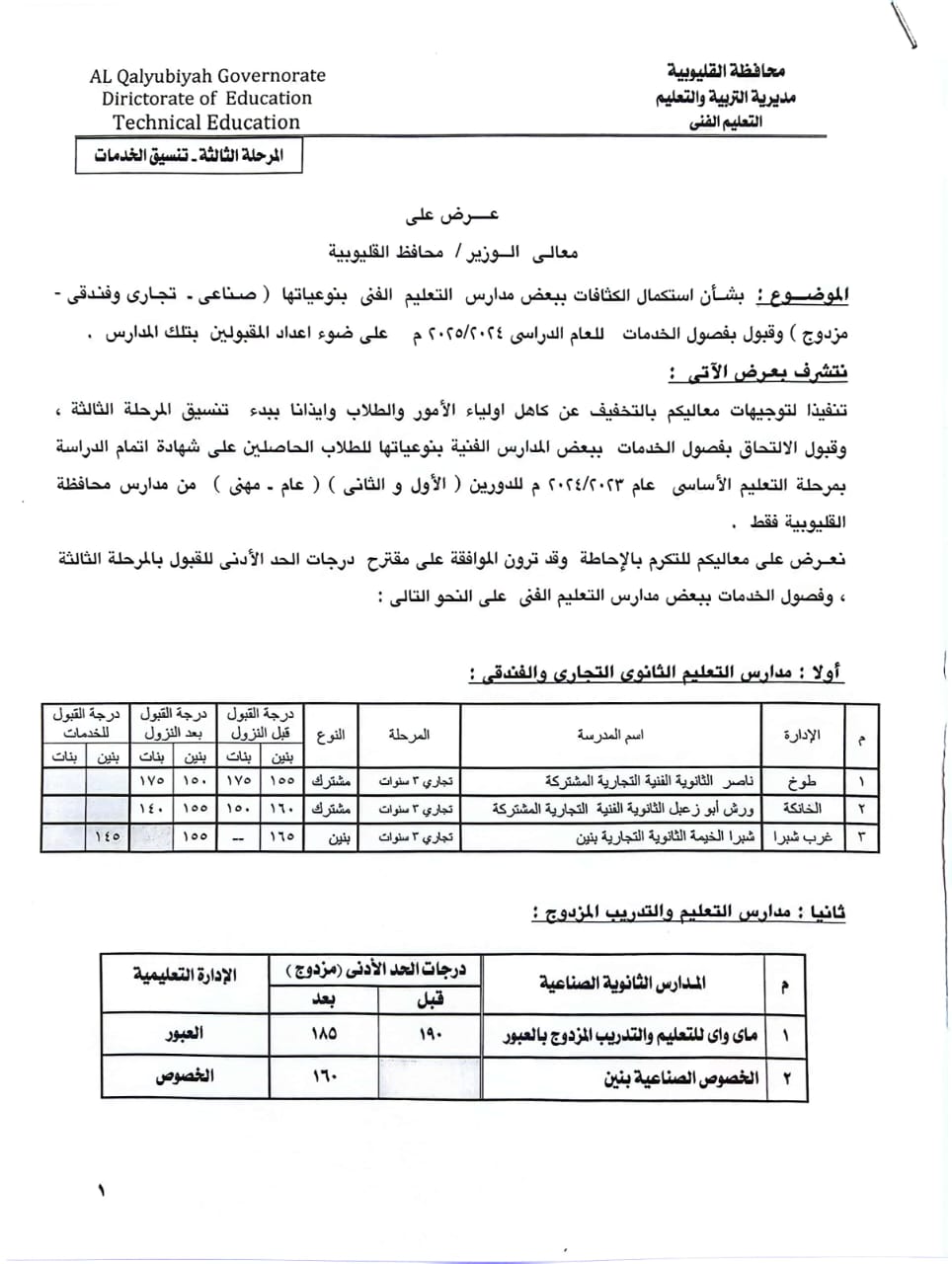 محافظ القليوبية يقرر النزول بمجموع فصول الخدمات ببعض مدارس التعليم الفني