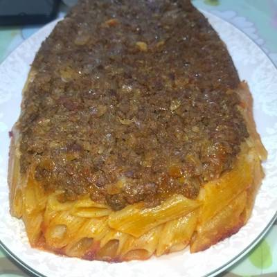 - وأخيرا أخرجي طاجن المكرونة بالسجق واقلبيه على طبق التقديم ليكون السجق والجبنة في الأعلى والمكرونة في الأسفل.
