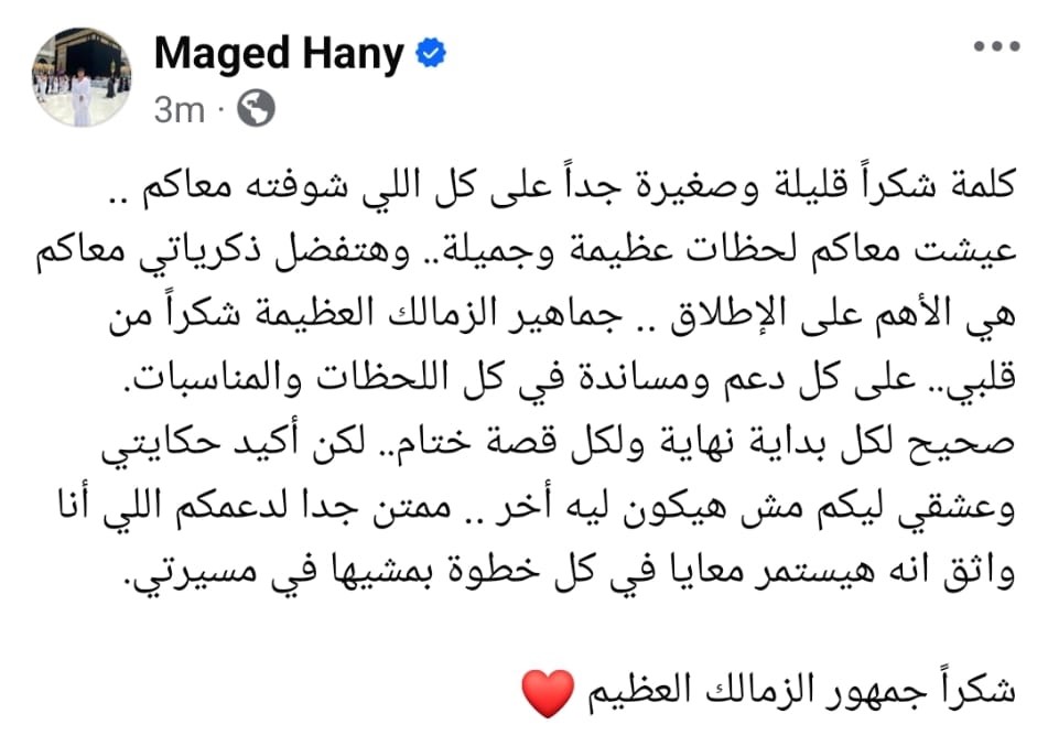 وكتب ماجد هاني عبر حسابه الرسمي على فيس بوك: كلمة شكرًا قليلة وصغيرة جدًا على كل اللي شوفته معاكم.. عيشت معاكم لحظات عظيمة وجميلة.. وهتفضل ذكرياتي معاكم هي الأهم على الإطلاق.. جماهير الزمالك العظيمة شكرًا من قلبي.. على كل دعم ومساندة في كل اللحظات والمناسبات.