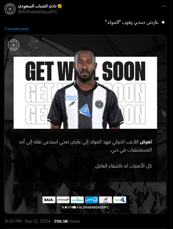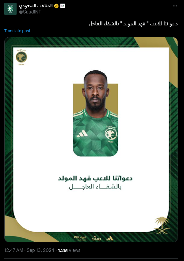 ونشر الحساب الرسمي للمنتخب السعودي على موقع التواصل الاجتماعي إكس: دعواتنا للاعب فهد المولد بالشفاء العاجل.