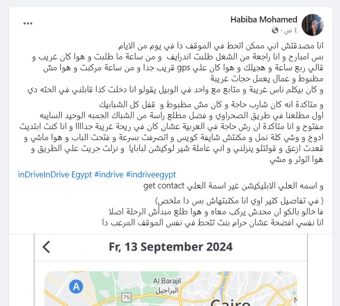 وقالت حبيبة محمد فتاة إندرايف في منشورها: أنا مصدقتش إني ممكن أتحط في الموقف دا في يوم من الأيام بس إمبارح وأنا راجعة من الشغل طلبت إندرايف ومن ساعة ما طلبت وهو كان غريب وقالي ربع ساعة وهجيلك وهوا كان على gps قريب جدا.