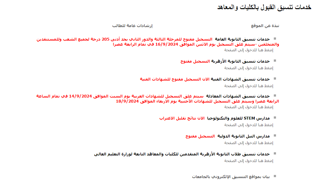 وقالت وزارة التعليم العالي والبحث العلمي، إنه تقرر فتح موقع التنسيق الإلكتروني على شبكة الإنترنت: tansik.digital.gov.eg للطلاب الناجحين في الدور الثاني للثانوية العامة لتسجيل رغباتهم لمدة ثلاثة أيام وذلك في الفترة من يوم السبت 14/9/2024 حتى يوم الاثنين 16/9/2024.