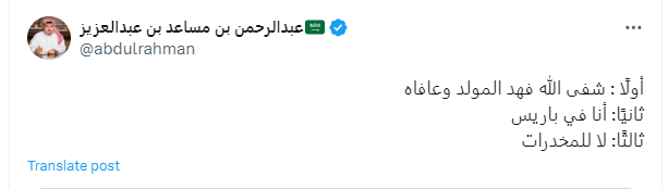 وأعاد عبد الرحمن بن مساعد نشر تغريدة لأحد الجماهير تم اتهامه فيها بمحاولة قتل فهد المولد، وعلق عليها: أولًا شفى الله فهد المولد وعافاه، ثانيًا أنا في باريس، ثالثًا لا للمخدرات.