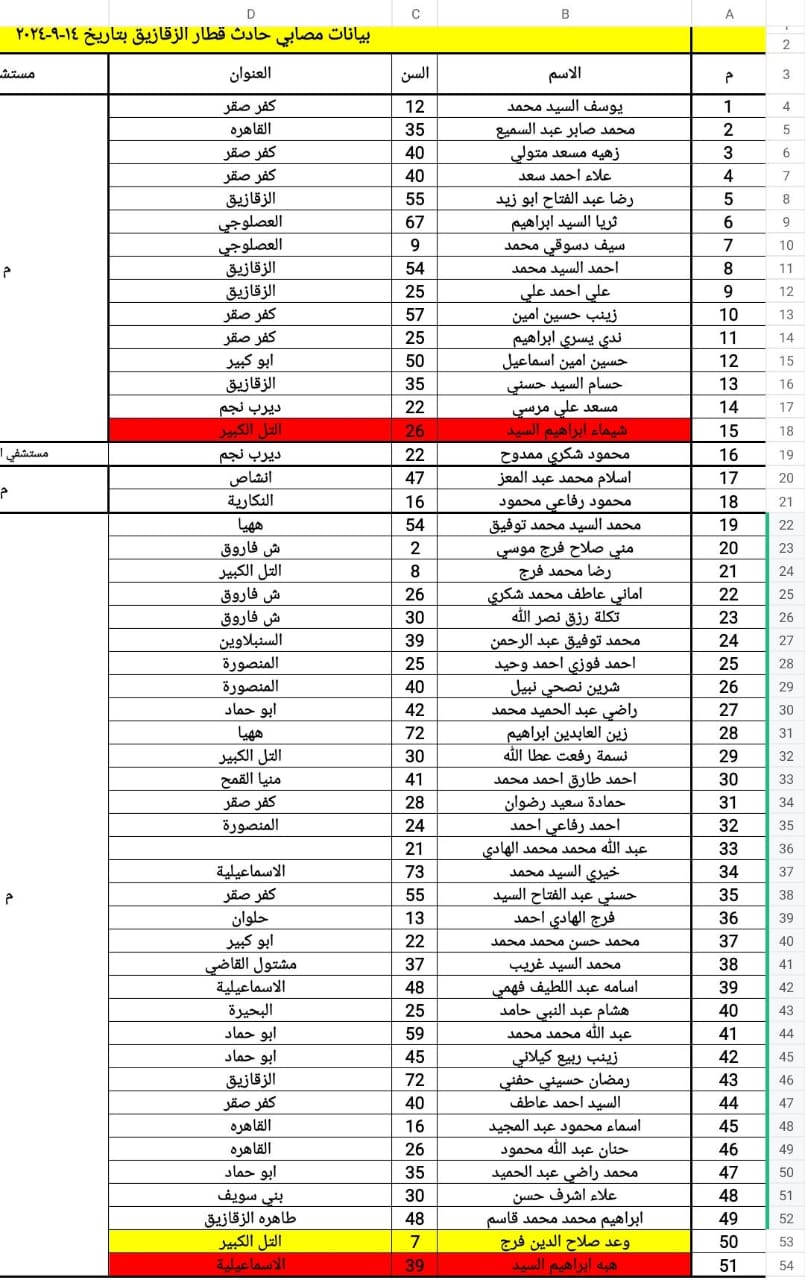 حصل موقع القاهرة 24 على أسماء المصابين والمتوفين في حادث تصادم قطاري الزقازيق بمحافظة الشرقية، والذي وقع مساء السبت، وأسفر عن 3 وفيات وإصابة 49 شخصًا.