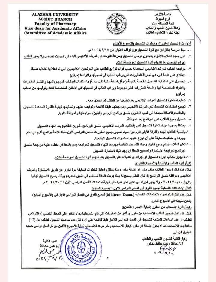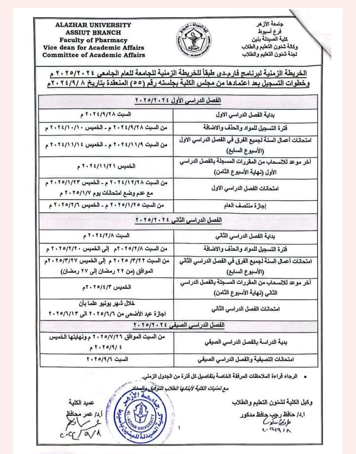الخريطة الزمنية للعام الجامعي ومواعيد وخطوات التسجيل والانسحاب بكلية الصيدلة بنين جامعة الأزهر بأسيوط