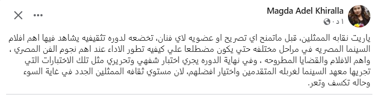 وكتبت ماجدة خير الله منشورًا، عبر حسابها الشخصي بموقع التواصل الاجتماعي فيس بوك، قالت فيه: ياريت نقابه الممثلين، قبل ماتمنح اي تصريح أو عضوية لأي فنان، تخضعه لدوره تثقيفية يشاهد فيها أهم أفلام السينما المصرية في مراحل مختلفة حتى يكون مضطلعا على كيفية تطور الأداء، عند أهم نجوم الفن المصري، وأهم الأفلام والقضايا المطروحة.