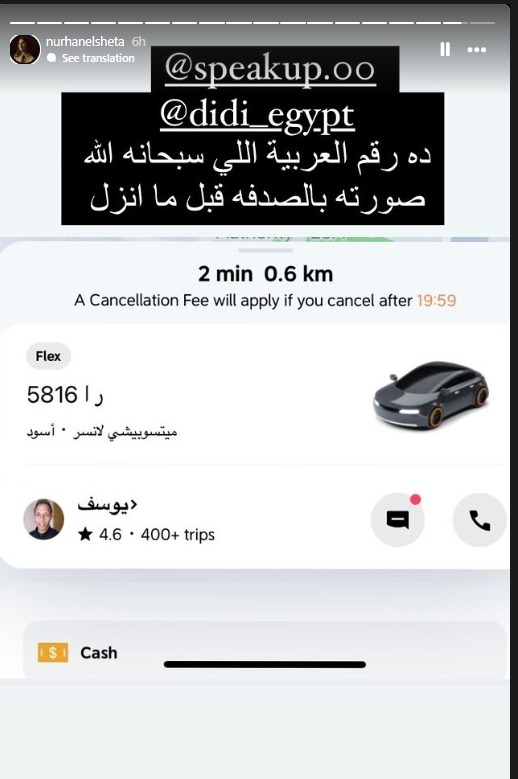 اتهمت فتاة تدعى نورهان، سائق في تطبيق ديدي بالقيادة وهو في حالة غير طبيعية، مطالبًة الشركة بالتحرك حيال الأمر، حيث نشرت عبر حسابها على موقع انستجرام فيديو روت فيه تفاصيل الواقعة.
