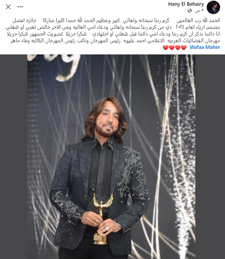 وكتب هاني البحيري منشورًا عبر حسابه الشخصي قائلًا: الحمد لله رب العالمين كرم ربنا سبحانه وتعالى كبير وعظيم، الحمد لله حمدًا كثيرًا طيبًا مباركًا فيه، جائزة أفضل مصمم أزياء لعام 2024، دي من كرم ربنا سبحانه وتعالى ودعاء أمي الغالية، وفي الآخر خالص تعبي أو شغلي.