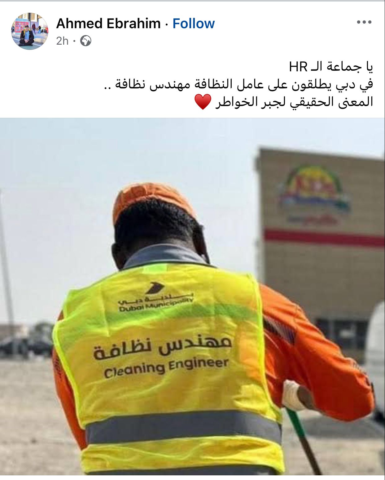 وشارك العديد من مستخدمي منصة فيسبوك للتواصل الاجتماعي، منشورا لأحد عمال النظافة في شارع بـ إمارة دبي بدولة الإمارات العربية المتحدة، يظهر وهو يحمل لقب مهندس نظافة، مما أثار إعجابا واسعًا بين مستخدمي منصات التواصل الاجتماعي.