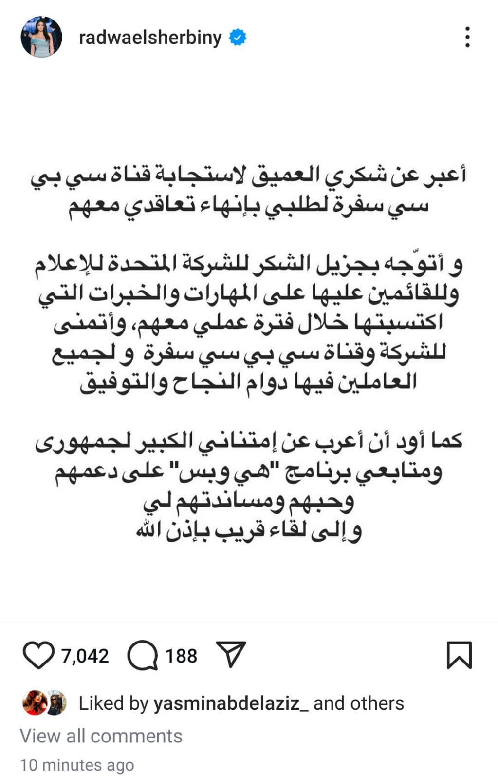 ويأتي ذلك تأكيدًا لما نشره القاهرة 24، حول إنهاء تعاقد رضوى الشربيني مع قناة CBC سفرة، حيث كتبت رضوى عبر حسابها بموقع انستجرام: أعبر عن شكري العميق لاستجابة قناة CBC سفرة، لطلبي بإنهاء تعاقدي معهم.