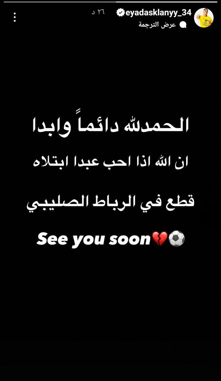 وكتب العسقلاني على صفحته الشخصية عبر منصة تبادل الصور والفديوهات انستجرام: الحمد لله دائما وأبدا، إن الله إذا أحب عبدا ابتلاه، قطع في الرباط الصليبي.