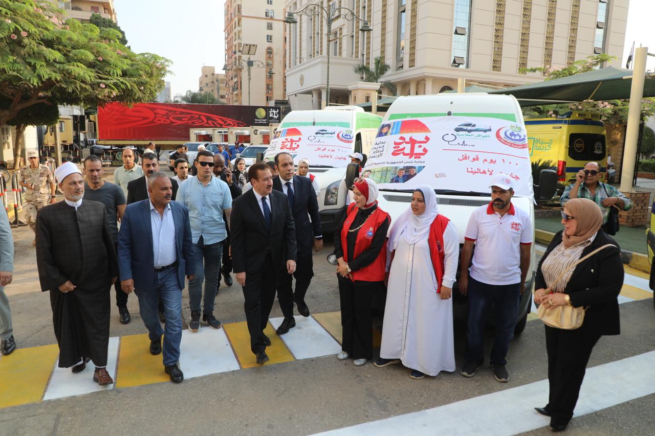 وتفقد المحافظ اصطفاف المعدات والسيارات الخدمية لجميع الجهات المشاركة تنوعت بين الإسعاف، الصحة، التضامن الاجتماعي، الشباب والرياضة، الهلال الأحمر، جهاز مشروعات الخدمة الوطنية، التموين، الشهر العقاري، شركة مياه الشرب والصرف الصحي، الأوقاف، سيارات المراكز التكنولوجية المتنقلة، صندوق مكافحة الإدمان، مشيرًا إلى أن المبادرة سيستمر فعاليتها لمدة 100 يوم.